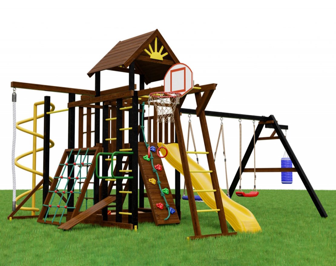 Комплекс помогает развивать все группы мышц, укрепляет здоровье и удерживает интерес надолго. Стойки выполнены из массива сосны, качели — из усиленного бруса 90×95 мм. Поверхности тщательно отшлифованы, дерево глубоко пропитано краской для защиты от влаги и солнца.