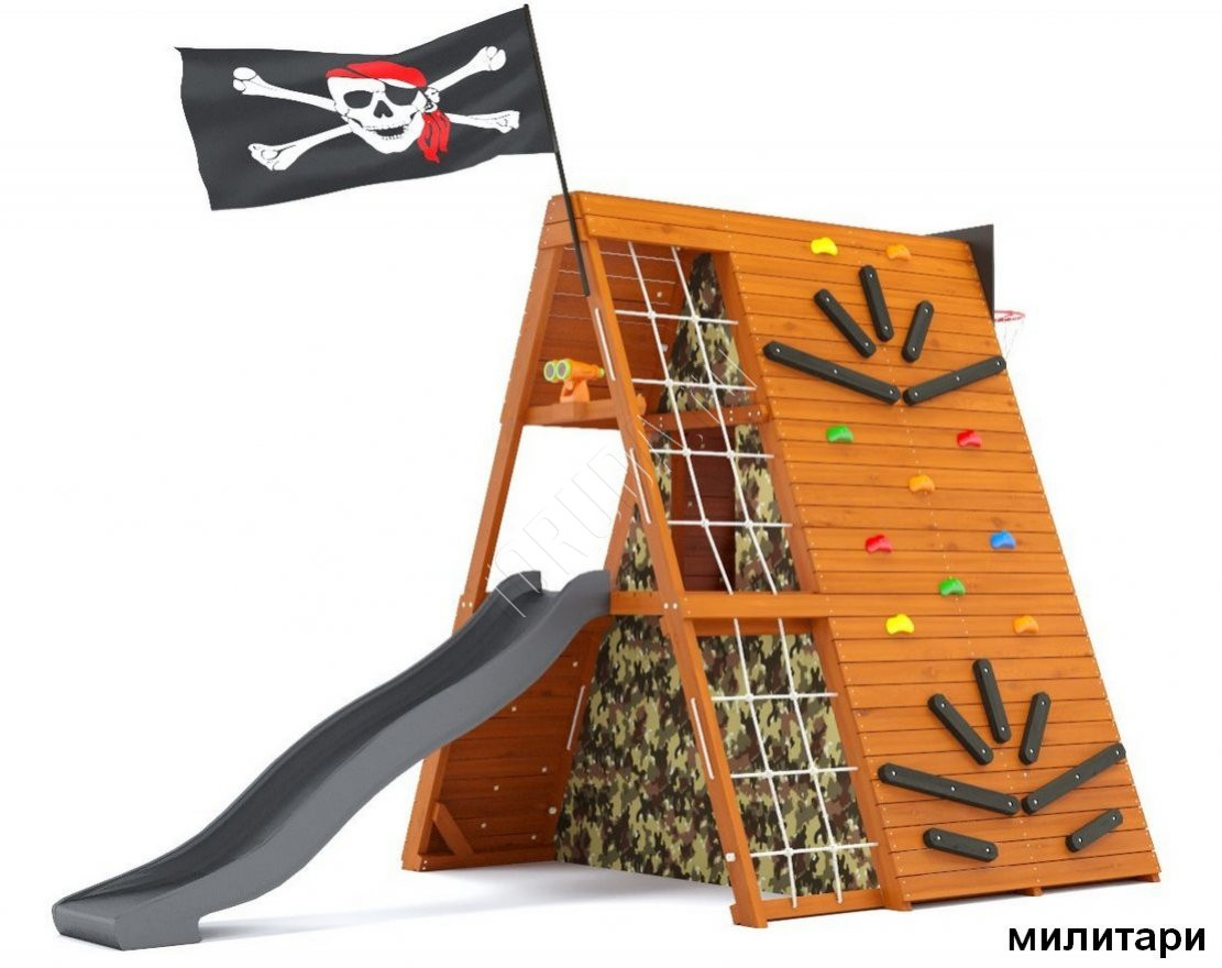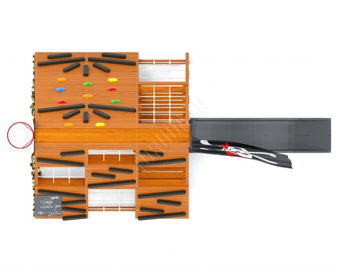 В домике есть всё, чтобы создать собственный мир игры и приключений: многосекционный скалодром с пластиковыми и деревянными зацепами, гладиаторские разноуровневые сетки, меловая доска для рисования и творчества, бинокль и даже баскетбольное кольцо со щитом. Внутренний лаз с выходом на платформу и внутренняя лестница - это ещё больше возможностей для детского творчества и активного отдыха.