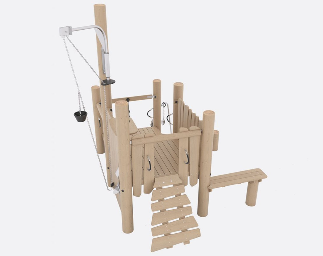Состоит из опорных стоек, платформ и панелей, предназначенных для игр с водой и песком. Панель оснащена металлическими ковшами, чашами, резиновыми ведрами и мельницами для песка. Для большего комфорта, в конструкции установлены ручки-стропы и уступы.
