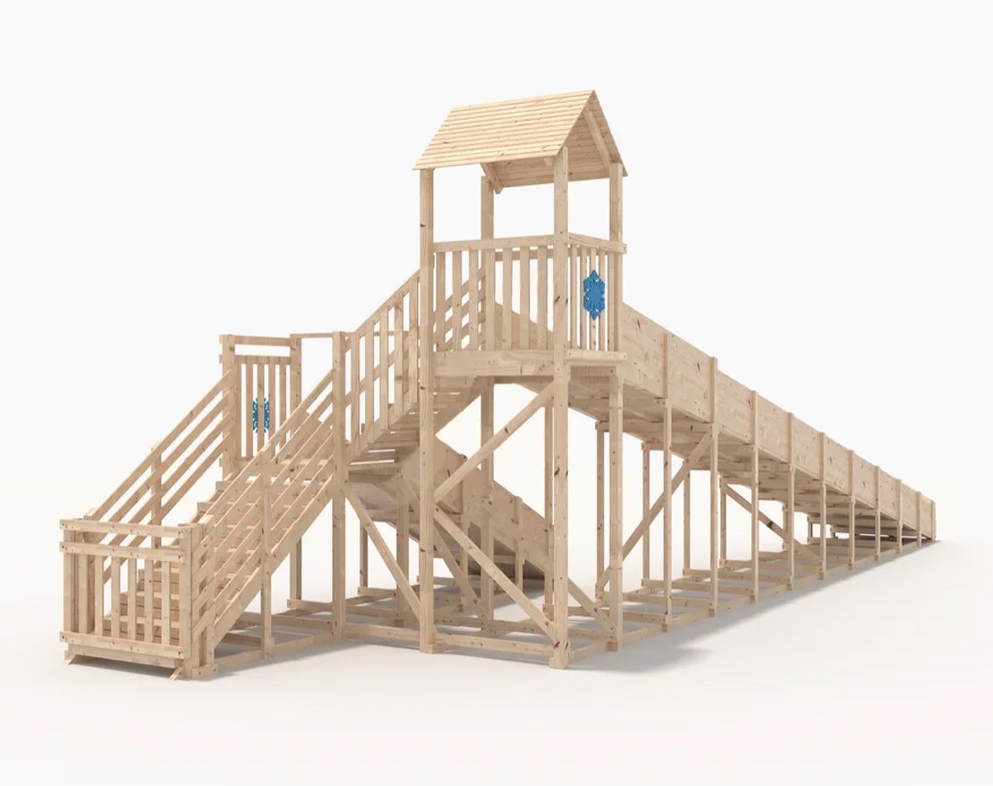 - Модуль безопасен для частного пользования, ведь конструкция оборудована бортиками, безопасными лестницами с перилами, усиленными балками. Имеется деревянная крыша.