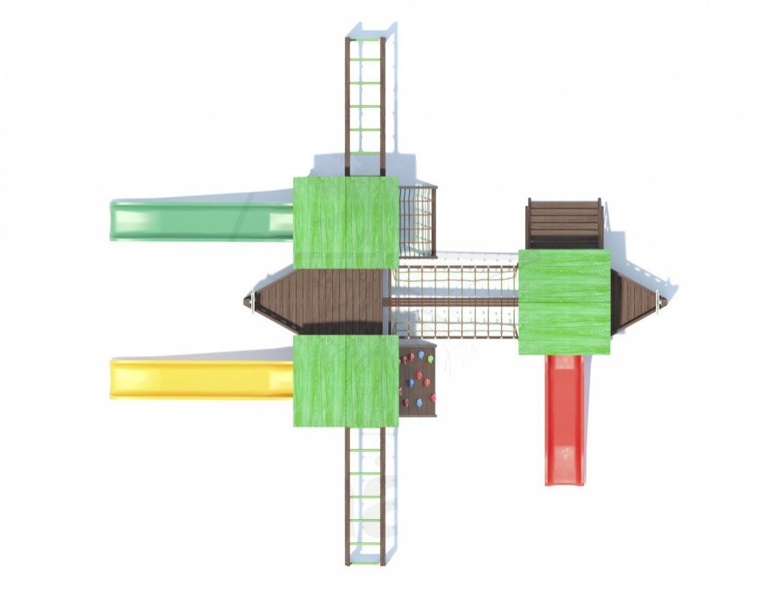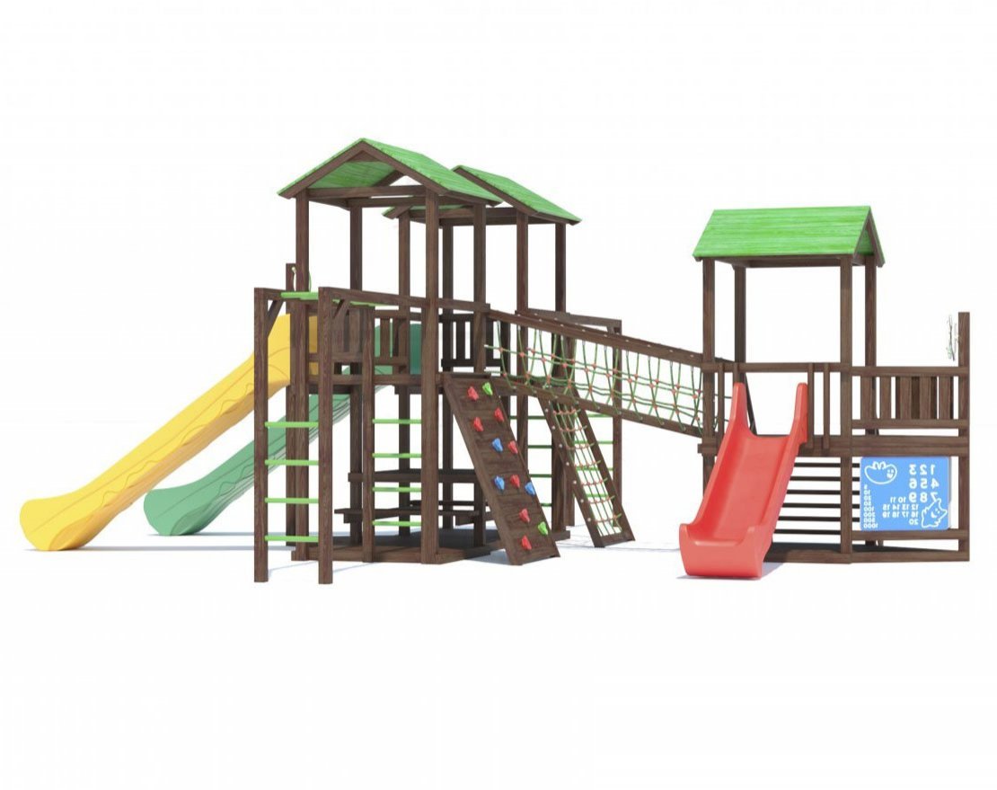 Основа детской игровой - спортивной конструкции – три башни с мостами и балконами «серия I». Конструкция оснащена тремя двухскатными деревянными крышами, встроенным полом, встроенным столиком с лавками в нижней части конструкции, тремя пластиковыми антивандальными скатами с превосходной скользящей поверхностью, двумя «П»-образными деревянными рукоходами, скалодромом, канатной лестницей с армированным канатом, деревянной лестницей, антивандальными пластиковыми игровыми панелями и антивандальными штурвалами. Для безопасности ребенка предусмотрены перила на лестнице, заборчики и ограждения над зонами препятствий (скат).