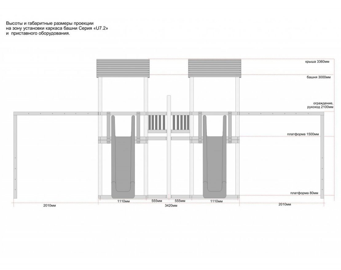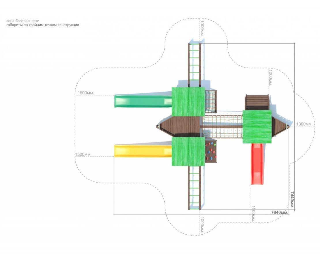 Для безопасной эксплуатации конструкции, площадка должна быть свободна от зеленых насаждений, сооружений и других конструкций, ровная, без перепадов уровня, без впадин и насыпей. Габариты площадки с учетом зоны безопасности длина 10900мм. ширина 10640мм., площадь площадки S-116м². Запрещено устанавливать конструкцию в зонах с повышенным риском провалов в грунте (болотистая местность, береговая линия водоемов, в непосредственной близости с оврагами и обрывами).