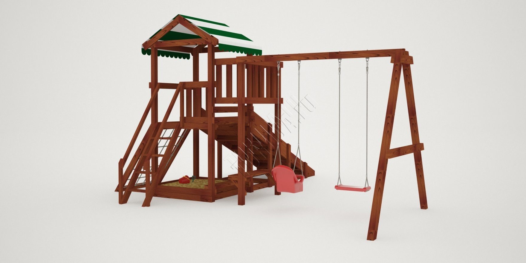 Поднявшись наверх можно поиграть на балкончике, с него будет открываться хороший вид на Ваш дачный участок. А быстро спуститься вниз малышам понравится с горки, цвет пластика на выбор: красный, желтый, зеленый, синий. Под платформой расположена квадратная песочница со сторонами 129 см, где можно более спокойно провести время, а отдохнуть на деревянной лавочке.