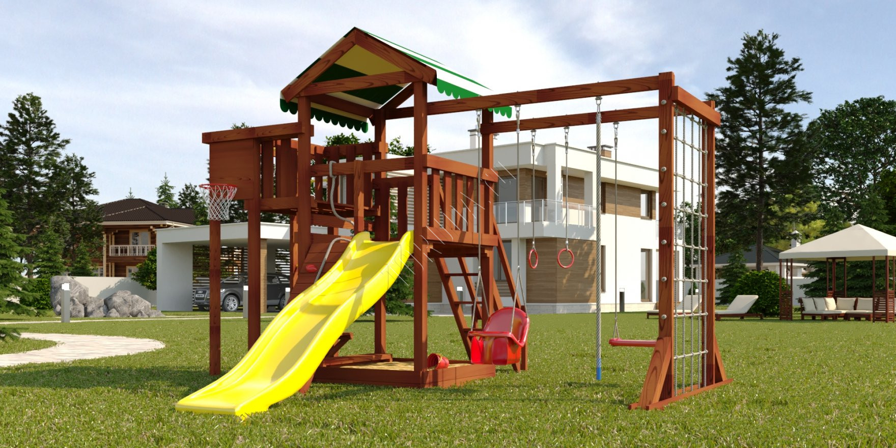 Укреплять мышечный каркас нужно с детства, бросая мяч в баскетбольное кольцо, вися на турнике и кольцах, карабкаясь по шведской стенке, канату, сетке-лазалке. Все это многообразие спортивных снарядов присутствует в Гарда 4 Бри. Для большей радости качели «Лодочка» и «Люкс» со спинкой.