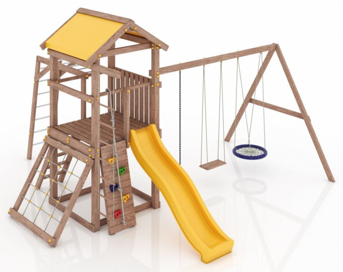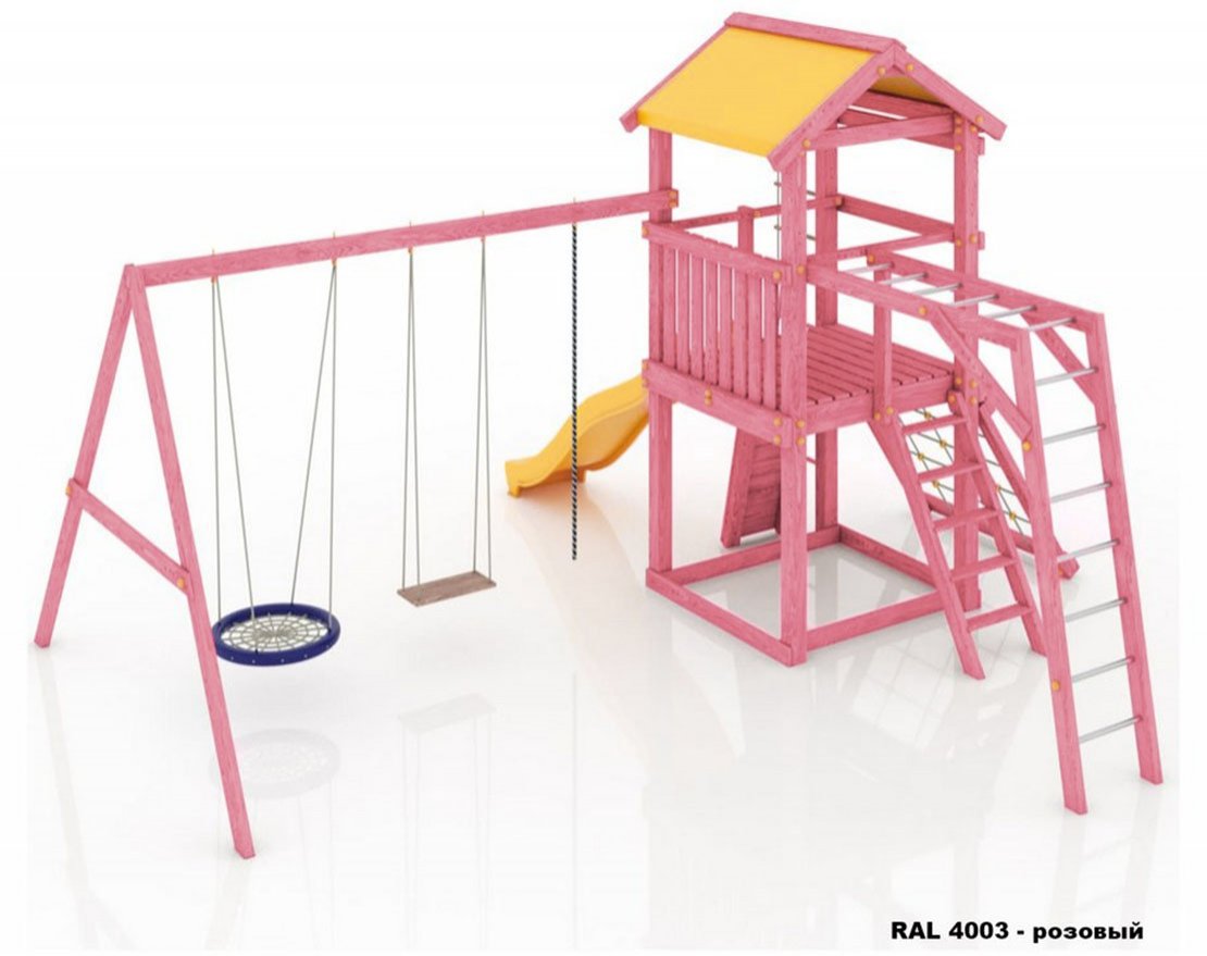 Детская площадка изготовлена в соответствии с ГОСТ Р 52168-2012. Опоры и несущие элементы изделия изготовлены из клееного бруса карельской сосны 90х90 мм, доска 40х90мм, 40х140мм, другие перекрытия 20х90мм доска, ограждение и иные элементы из массива сосны. Везде используется сухая доска.