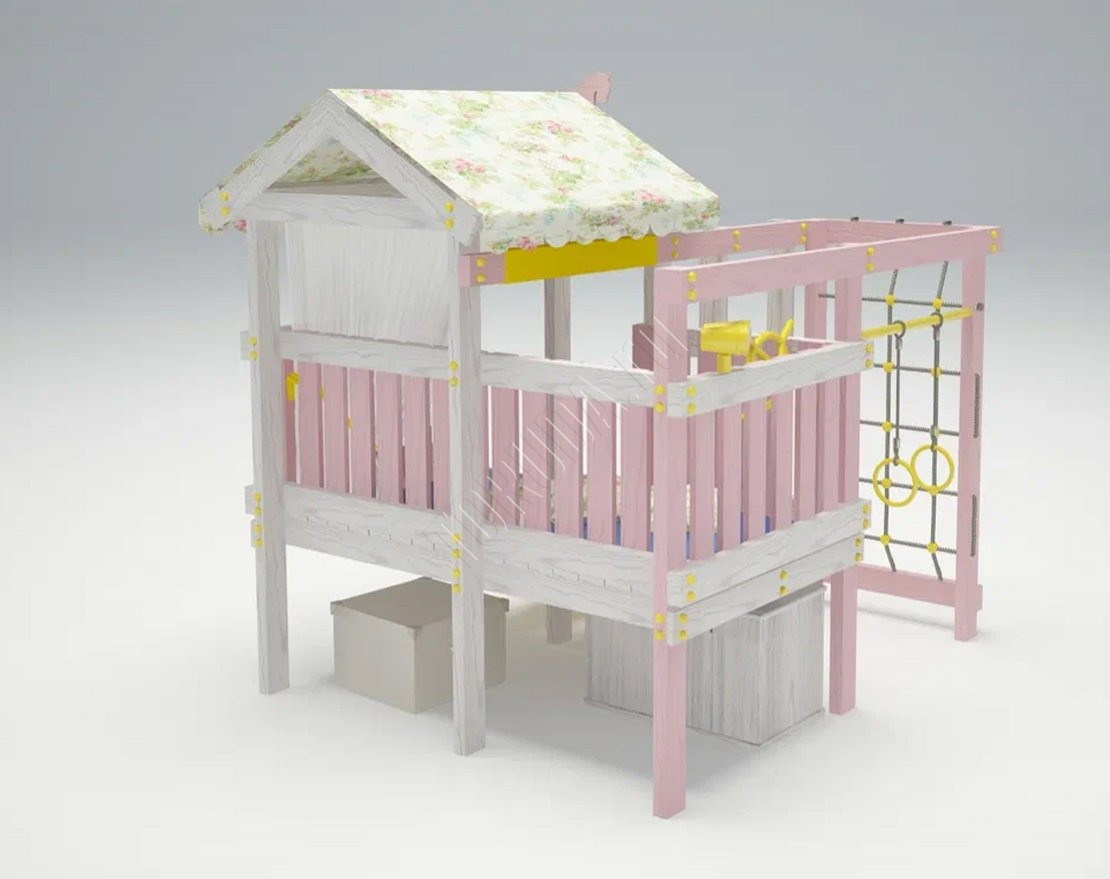 - Модель включает в себя три объединенных зоны: домик на платформе высотой 60 см, балкон и спортивный комплекс. Пространство под детской площадкой позволит хранить небольшие ящики. Ребёнок может положить туда мягкие игрушки, машинки, мячи и прочие предметы.