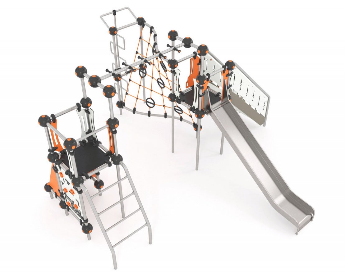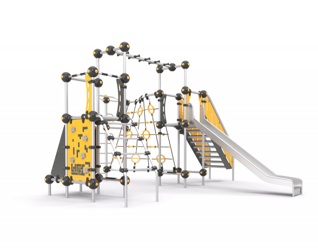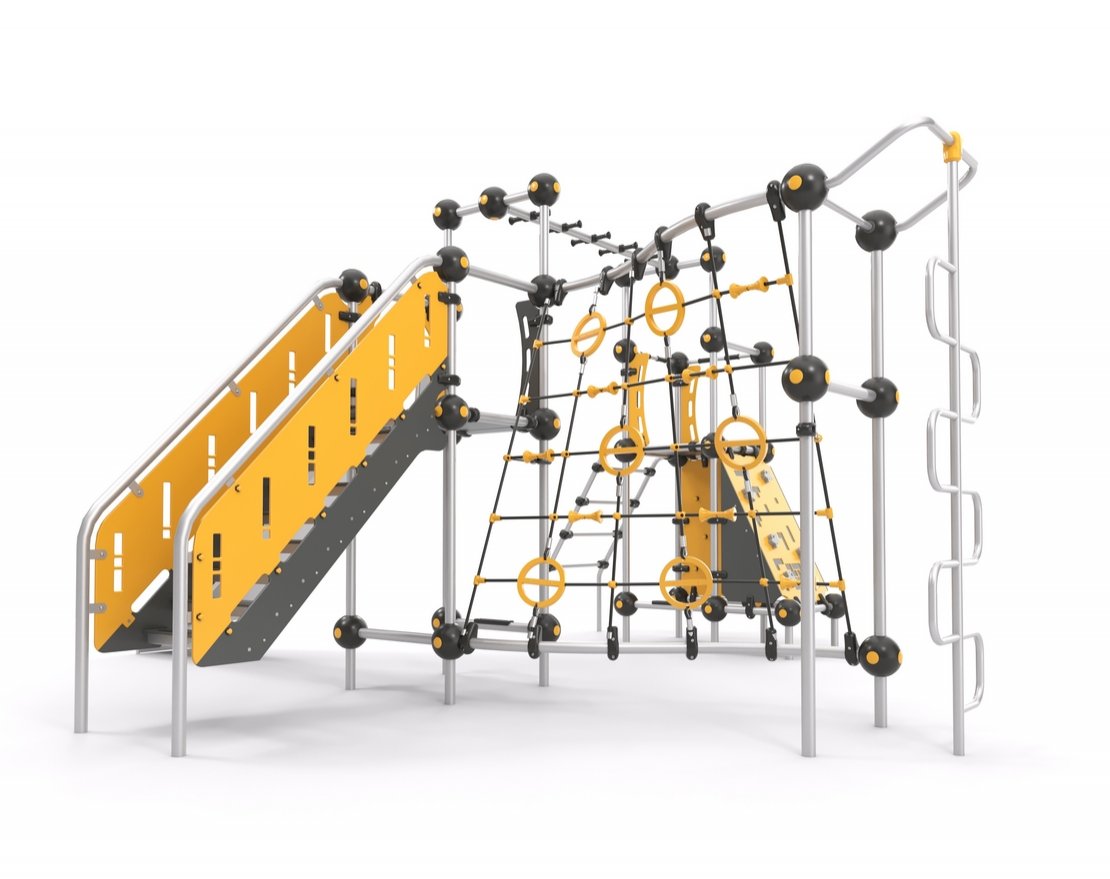 Состоит из металлического каркаса, канатной сетки, открытой горки с защитными бортиками, лестницы и скалодромной панели.