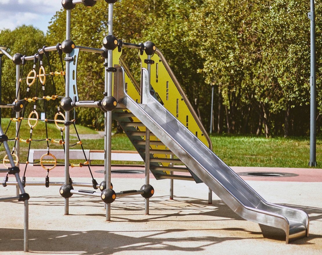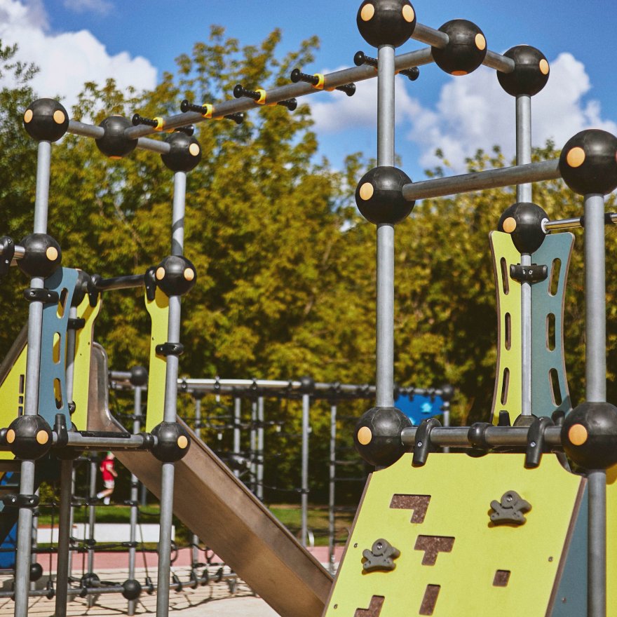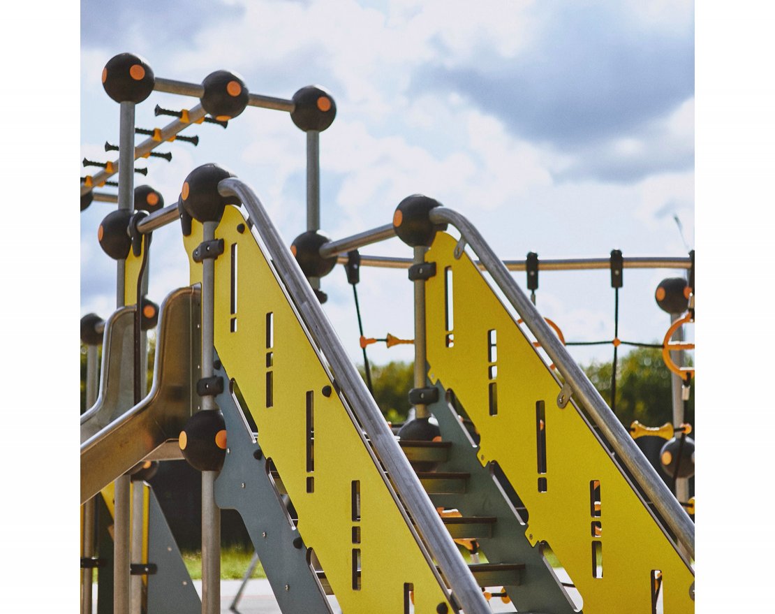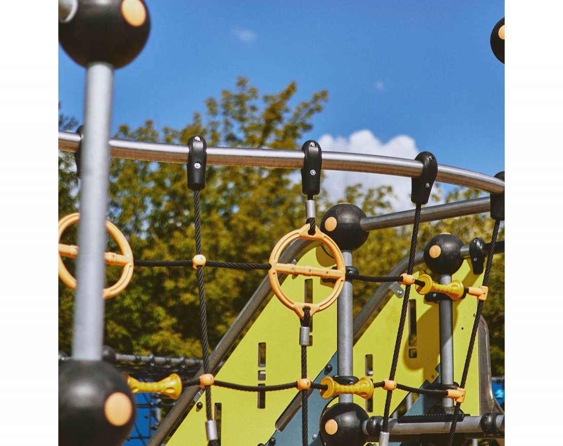Состоит из металлического каркаса, канатной сетки, открытой горки с защитными бортиками, лестницы и скалодромной панели.